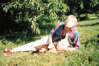 Joson passed away after suffering a stroke at Kennebec, Ohio in July 1998, aged 16. He passed away knowing that his son Ch, Phi-Vestavia Evan Evans had just won best of breed opposite at the 1998 national handled by his owner Peter Clifton who was also returning with Evans to England. Joson also had a final tear full final reunion with Peter at Kennebec (see Photo) after the national, Later he looked down to see his son follow in his footsteps and the Joseter tradition by going best in show at the U.K. Cardigan Welsh Corgi Ass national championship show in 2000.