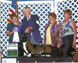 At the 2003 American Annual National Speciality I handled my home bred Joseter Blue Cafe now owned by Shirley Hobbs to Best of Winners and Best of Breed Award of Merit.