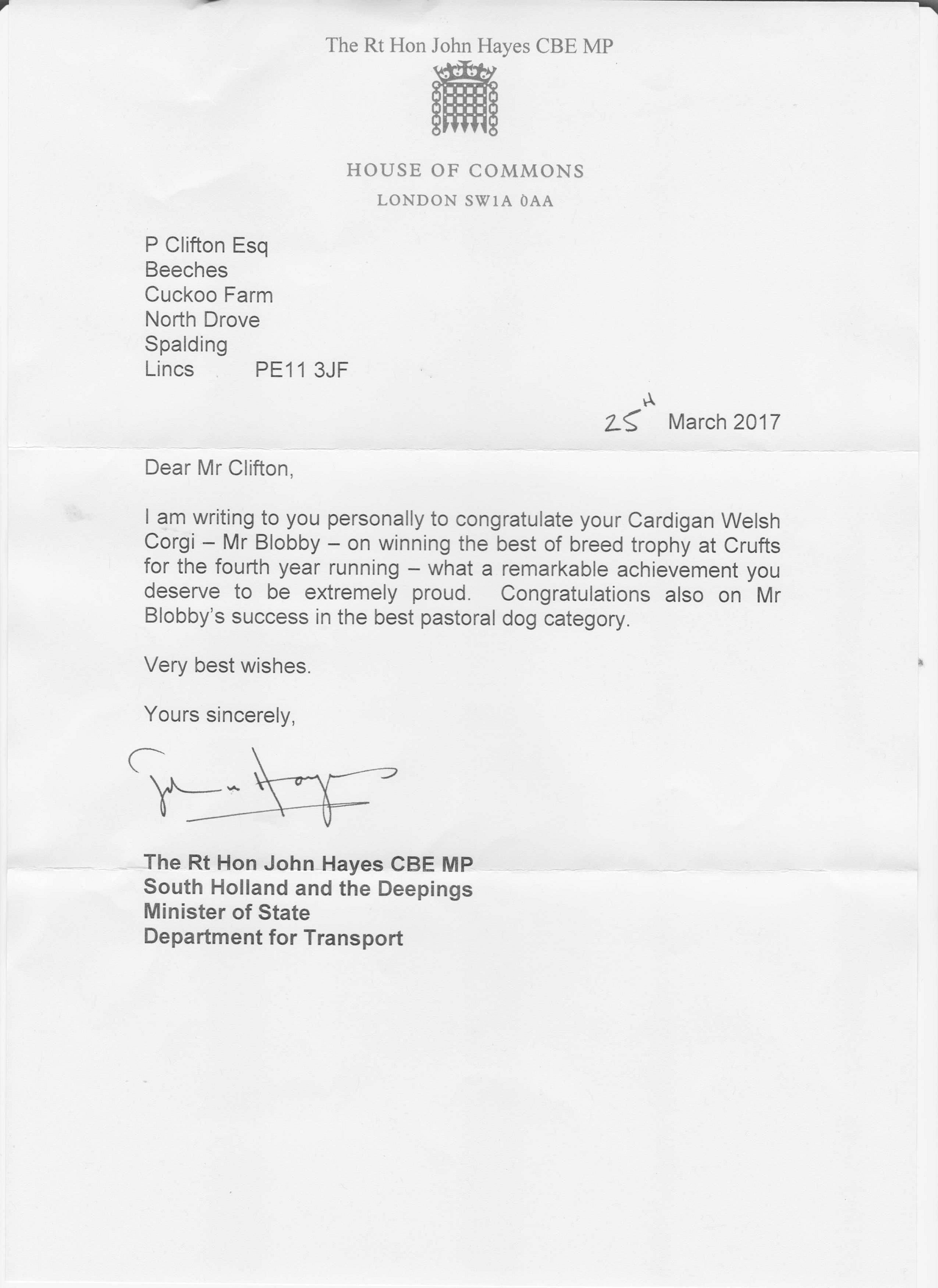 After Crufts 2017 we received a letter from our Member of Parliament John Haynes congratulating us on Crufts best of breed (photo at botton of page).