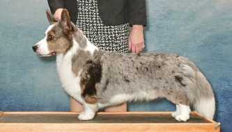 1st - Kingsbury Bossis Gentleman Caller. Reserve winners’ dog. 9-months-old; attractive, all male; balanced head, correct eye and ear shape thus the whole head gives a true Cardi expression. Nice side outline, balance tail set and angulated hindquarters, Excellent shoulders, tight elbows, well boned for size, correct feet. Still carrying heavy acceptable puppy coat which does make this boy look a shade heavier than he really his. Moves very true front and rear but would like a shade more effort. Presented in excellent condition and handled with softness and understanding.