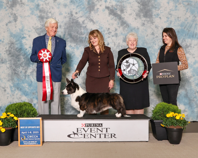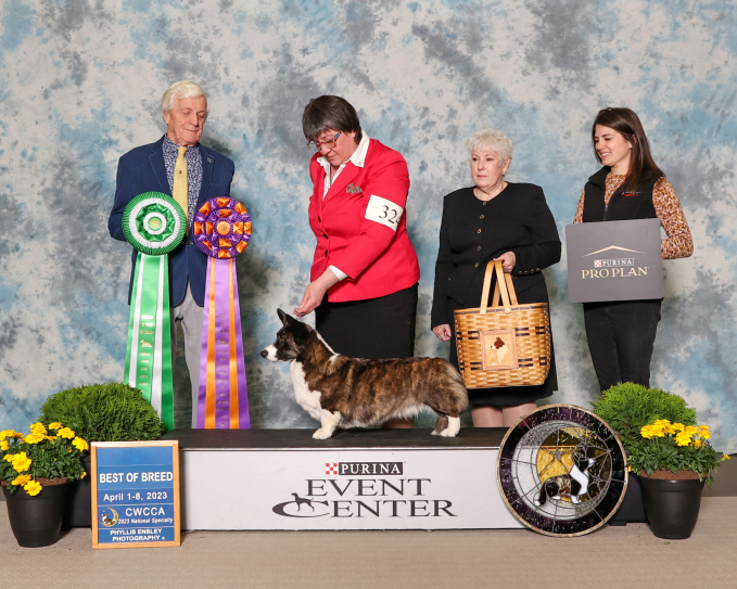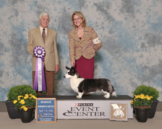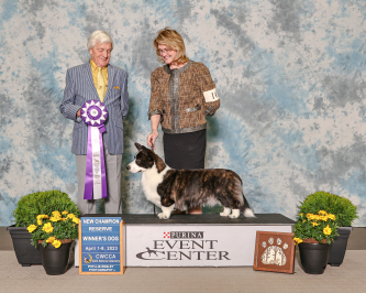 1st - Winbucks SilverFern Double Oh Seven. Impressive 2-year-old with lovely side outline and overall balance for age. Masculine head, correct eye, ear shape and true Cardigan expression. Ample neck that runs smoothly into withers, correct topline standing and on the move. Strong, well angulated rear quarters. Nice body shape, good forechest, tight elbows with line running up into withers.