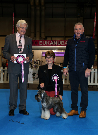 1. Davidson, Wellingley Way On Up Min Sch of 7 mths and day two winner. Lovely head nice eye and ear set and shape with all giving a true male expression. Ample arched neck fitting correctly into withers, nice firm topline and depth of body. Excellent shoulders, tight elbows straight well boned front tidy feet. Nice rear angulation moves with effortless freedom and so true. Presented in excellent coat and body condition without being overdone in any way.