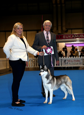 2. Taylor & Taylor-Morris, Pelenrise Don't Stop Moving Siberian Husky Pleasing head nice eye and lovely alert expression. Ample neck fitting nicly into withers, good length about body condition for age. Liked his fore and rear quarters straight front and feet. Moves sound and does have an air of quality about him standing and on the move